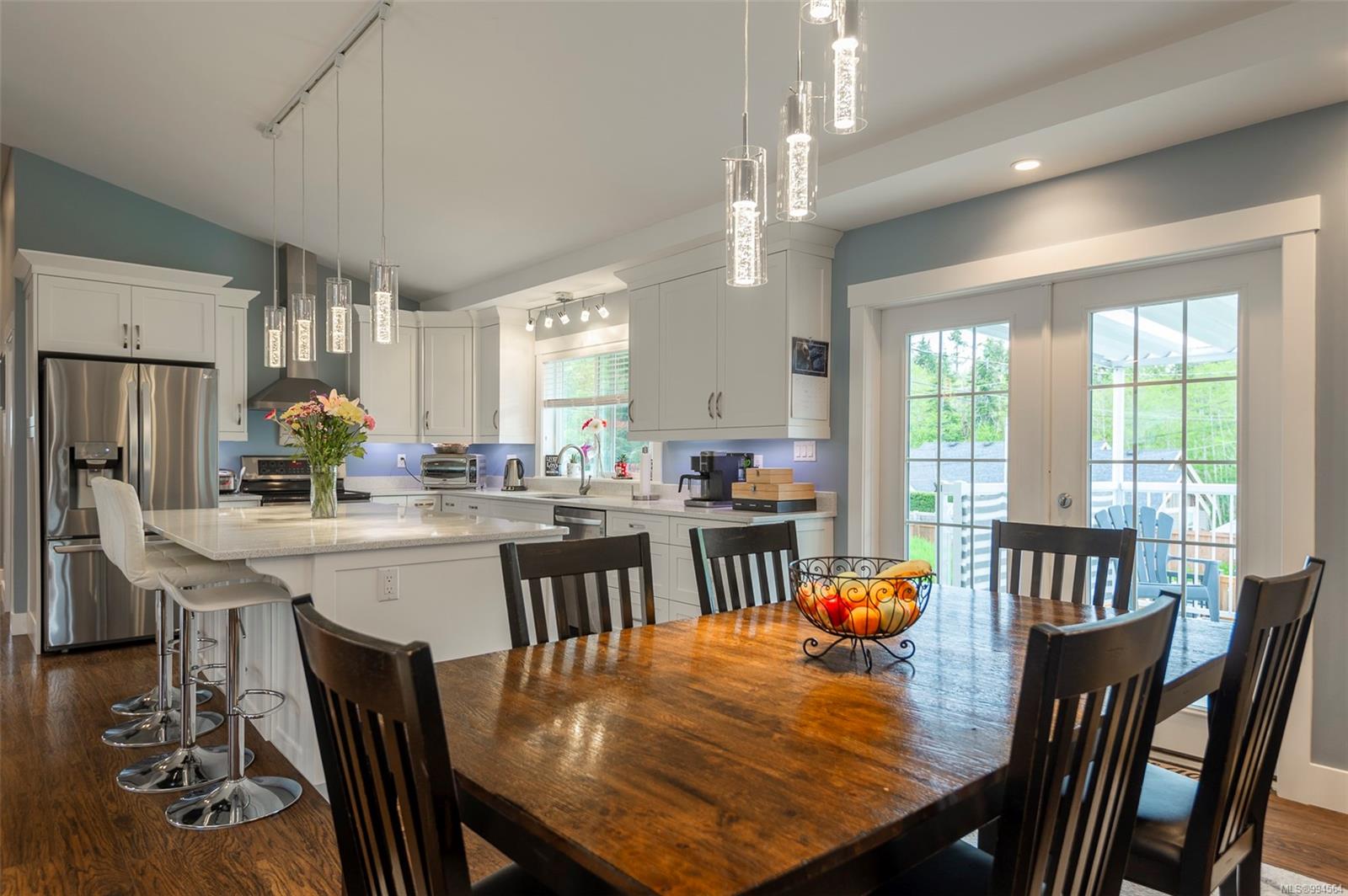 The heart of the home is the gourmet kitchen, showcasing quartz countertops, a large island for gathering, and custom shaker-style cabinetry. The adjoining dining area opens through double French doors to a private, fully fenced backyard retreat—featuring a spacious garden with its own well for irrigation and a charming catio.